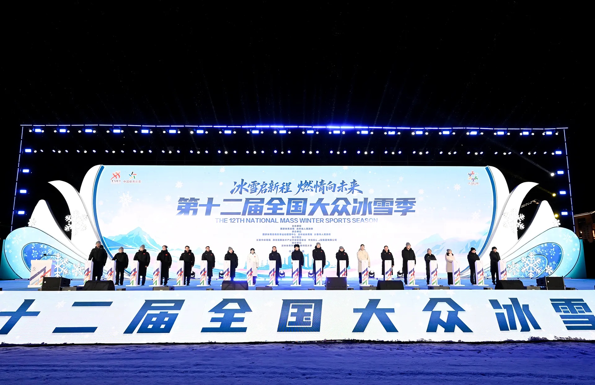 19时许,启动仪式正式开始,全场奏唱国歌。省政府党组成员金育辉致欢迎辞,诚邀各地朋友到吉林滑粉雪、赏雾凇、观冬捕,携手共创大众冰雪运动更加美好的明天。国家体育总局副局长佟立新致辞,预祝第十二届全国大众冰雪季圆满成功。国际奥委会主席考文垂视频致辞,祝愿大家度过一个精彩纷呈的雪季,尽享运动之乐、友谊之暖、冰雪之欢。优秀运动员代表周洋、武大靖共同宣读《冰雪运动倡议书》,文化和旅游部产业发展司司长缪沐阳发布“跟着赛事去旅行”2025—2026中国冰雪赛事活动目录。