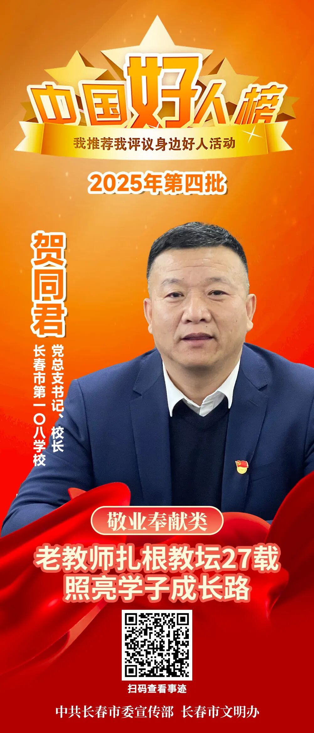 长春市第一〇八学校党总支书记、校长贺同君,荣登2025年第四批“中国好人榜”。