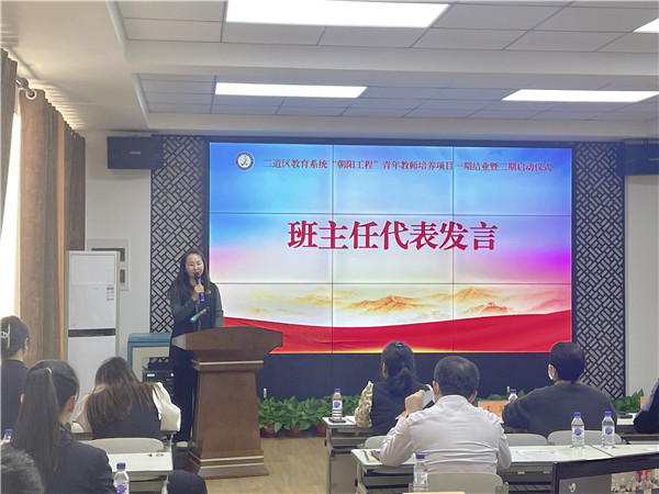愿往事可回首,愿岁月亦可期。班主任代表王宇老师在会上给予了一期老学员的殷殷嘱托,又给予二期新学员的殷切期望。同时也代表所有班主任向全体教育人宣誓,必将担起青年教师的培养大任,不负使命,在党的二十大精神的鼓舞下,踔厉奋发、勇毅前行,为二道教育事业谱写新篇章!
