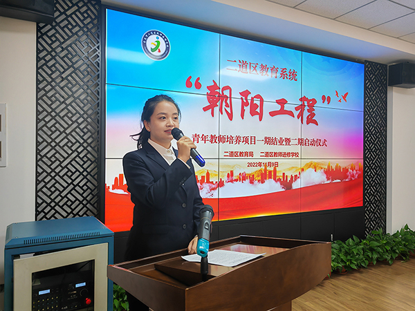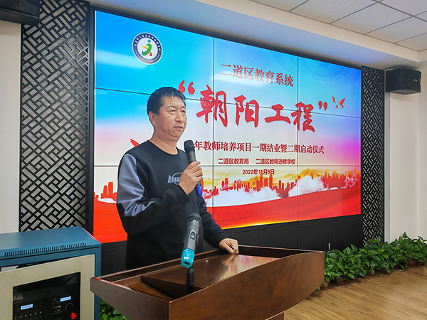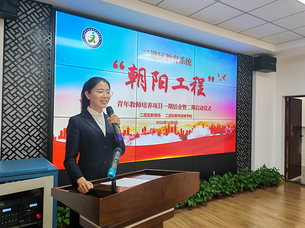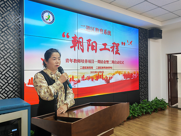 首先,进修学校朱桂荣副校长对“朝阳工程”一期工作进行了全面总结。肯定了两年朝阳工程成果,通过短片回顾见证了323名一期学员的历练和成长。特别是他们在学校教育教学、教科研、班主任管理、信息技术能力应用等方面所表现出来的能力和水平是二道区将朝阳工程持续推进的动力和决心。