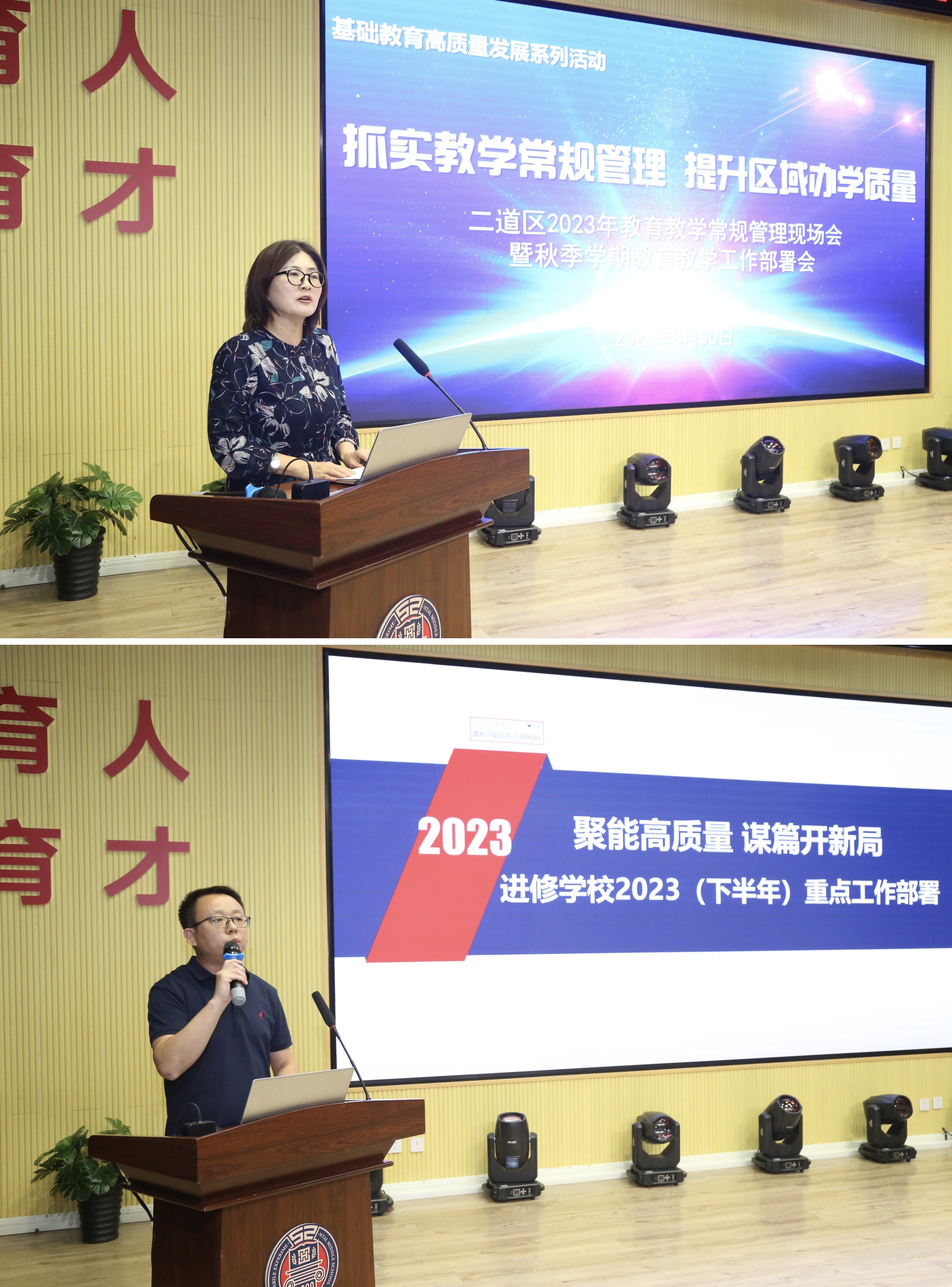 会议部署。区教育局基础教育科徐丽萍科长分别就4方面工作、27条具体任务进行部署。围绕招生控辍、集优化改革、“双减”落实、质量提升、均衡分班等工作全面总结及部署;区进修学校王洪军副校长以“提质增效教研工程、干部教师赋能工程、信息资源建设工程”3大工程6个项目做重点工作安排。