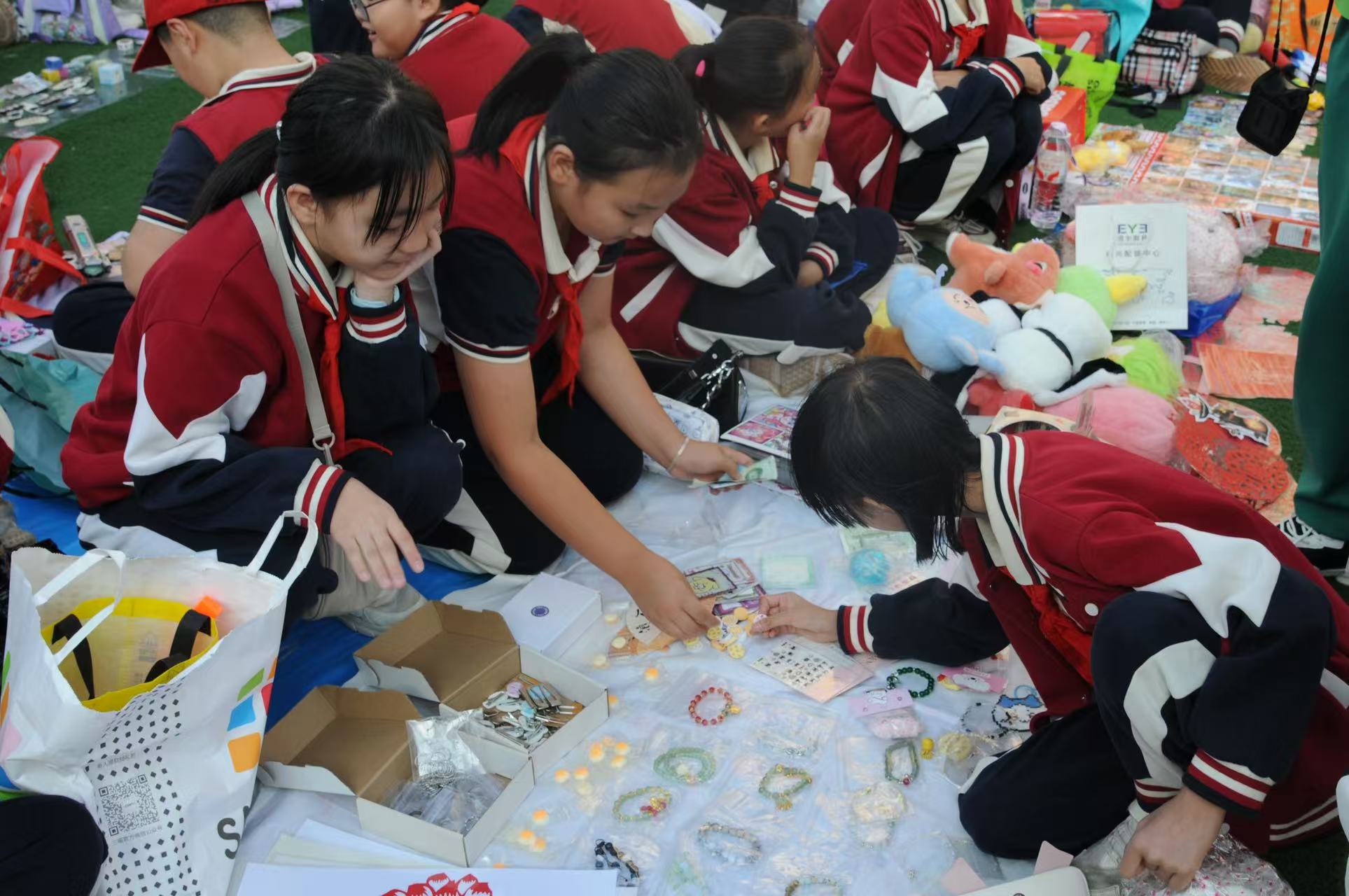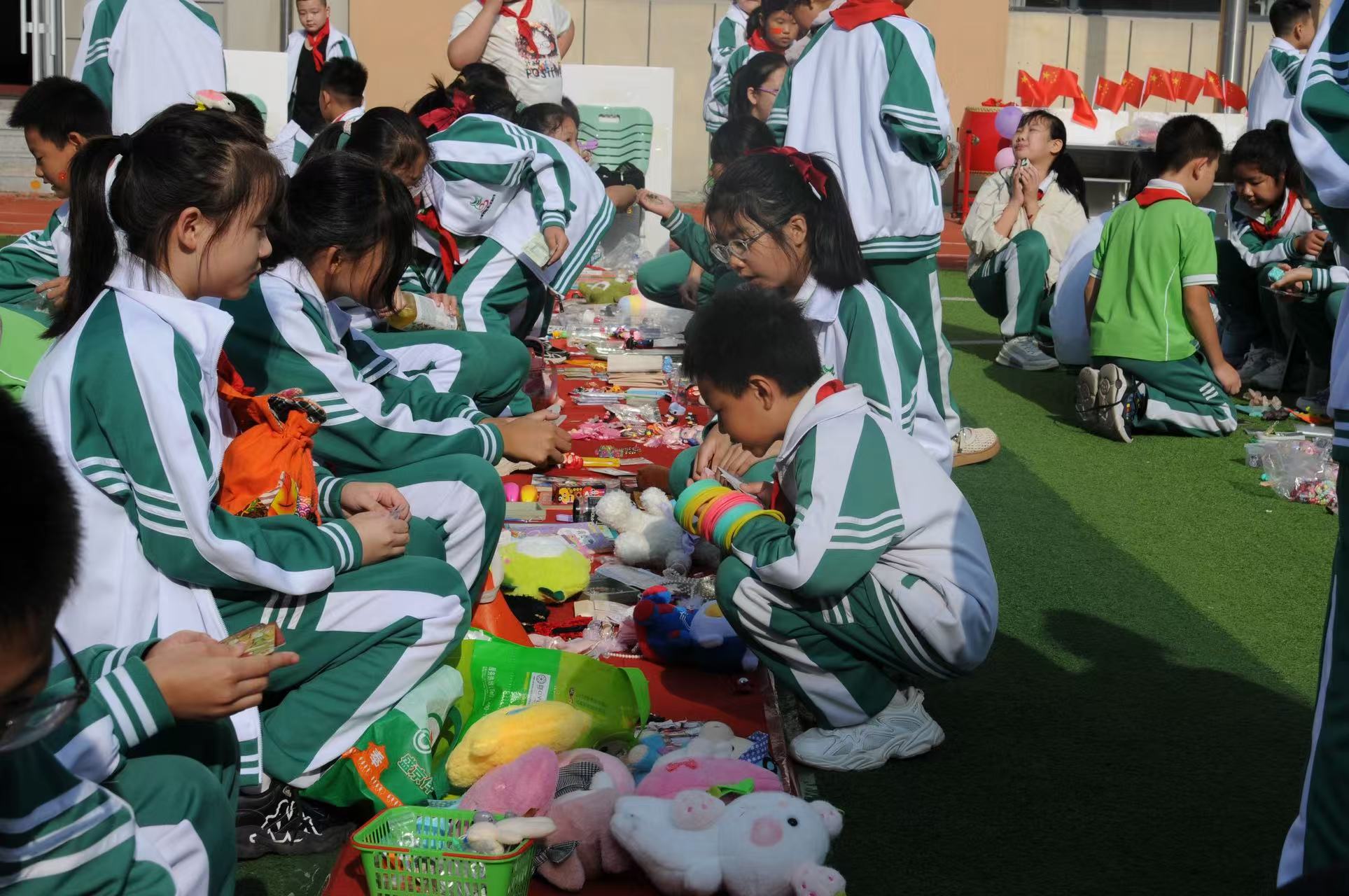 “小老板” 们各显神通 —— 有的主动上前介绍商品亮点,有的耐心回应 “能不能便宜 1 块钱” 的讨价还价,还有摊位创新推出 “盲盒抽奖”“砸金蛋” 活动,吸引大批 “顾客” 排队。学前班的小朋友也不甘示弱,拿着自己的毛绒玩具参与 “以物易物”,换到心仪玩具后笑着说:“不用花钱就能换到喜欢的东西,太开心啦!” 全校老师也走进集市驻足现场,为小 “经营者” 们的创意与勇气点赞,在互动中感受知识转化为实践的鲜活力量。 - 中场互动