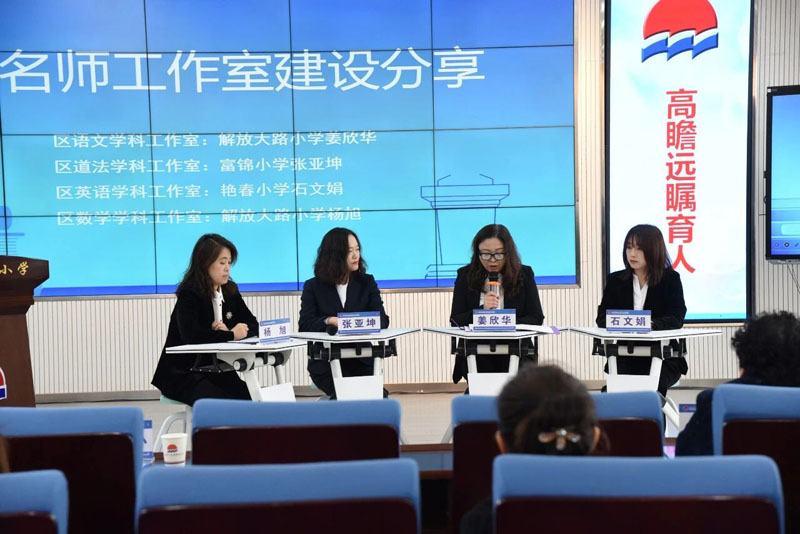 吉大附小——解放大路小学大学区四位学科名师工作室主持人,分别结合语文、道德与法治、英语、数学学科特点,从团队建设、课堂教学、课题研究、辐射引领等方面,分享了2026年度工作室建设思路与规划。