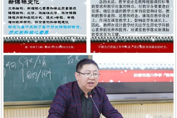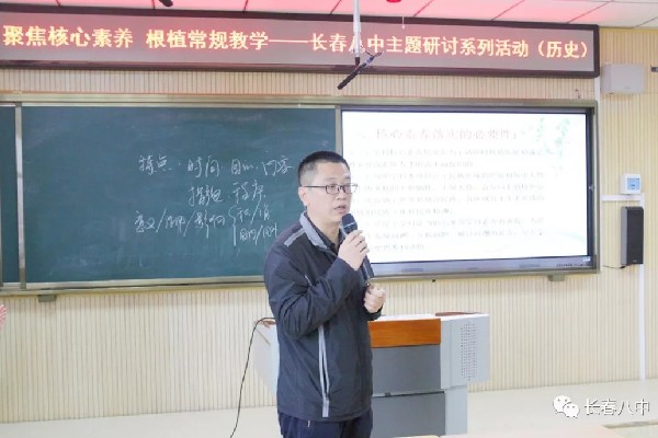 对标课程标准,厚植立德树人之基。自新课程标准出台以来,长春市第八中学组织了两次立足新课程标准、全面推进学科核心素养落实的教学论坛活动,提高了学校教师对新课程标准的认识,强化了教师立德树人的基本功。在此基础上,学校为了进一下推动教师深入研究课标、落实核心素养,本学期又组织了“聚焦核心素养,根植常规教学”——长春八中主题研讨系列活动,第一场数学学科研讨活动已圆满结束,4月19日进行的是历史学科专场。活动由历史组组长姜振雷老师主持。