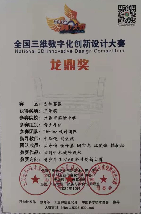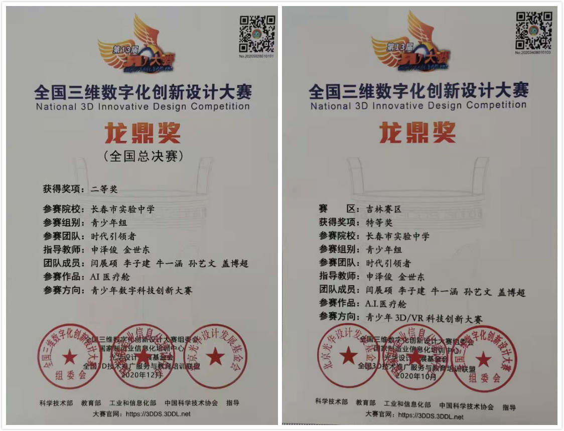 在2020年十二月份,作为队长带队参加了本届青少年3D科技创新大赛,并荣获了吉林省青少年组特等奖,及全国青少年组二等奖。