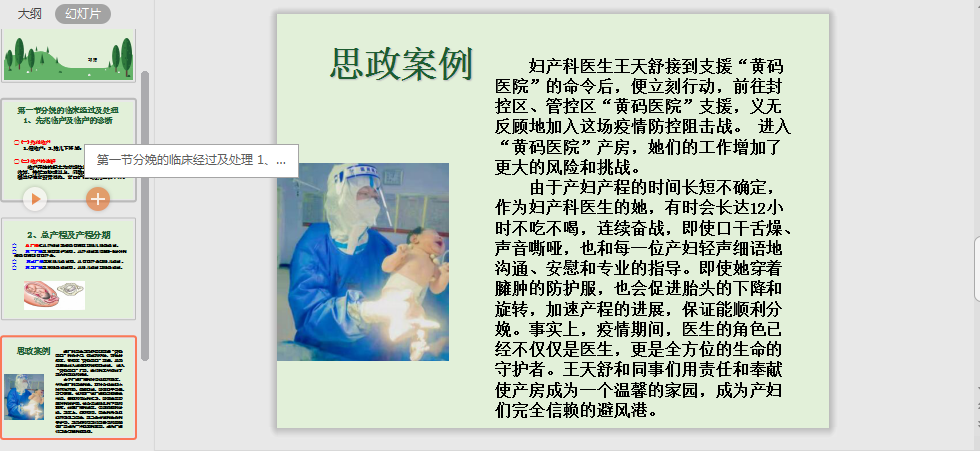 案例分析法广泛应用,各个课程组积极建设课程思政案例库,通过与教学内容紧密融合的案例分享,引发学生的思考,在潜移默化中进行德育培养。如《正常分娩》课程组引入妇产科医生王天舒接到支援“黄码医院”的抗疫案例,使学生对“人民主体观”、“无私奉献观”、“为民服务观”和“抗疫精神”等有了更直观的认识、更深刻的领悟和更强的获得感。《儿科护理》课程组在讲授新生儿与新生儿疾病患儿护理时,引入林巧稚首创换血疗法拯救新生儿溶血病案例,既体现了林巧稚医生善于钻研、勇于创新、有担当的精神,又体现了她的无私无畏与仁爱之心。《就业指导》课程组以真实学生就业案例分析了后疫情时代毕业生就业的机遇与挑战,提出在课堂上要引导学生就业观念等。