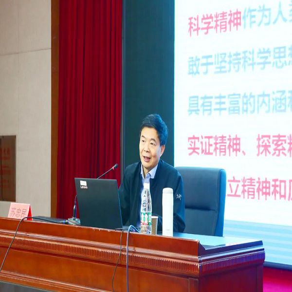 今天苏教授授课的题目是《弘扬科学家精神,做新时代追梦人》,他围绕“弘扬科学家精神”“五育并举 德育为先”“珍惜学习成长环境”“立人生梦想 做有志青年”四个方面,讲授中国科学家的奋斗历程和我国科技前沿研究成果,介绍我国在“应用量子化学”和“功能材料化学”领域积极开展的实验研究,介绍了我国科学家及前沿科技成果,激励青年学生融入时代发展,做新时代追梦人。