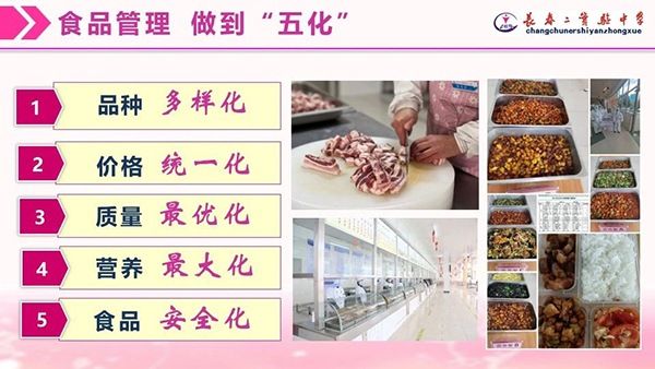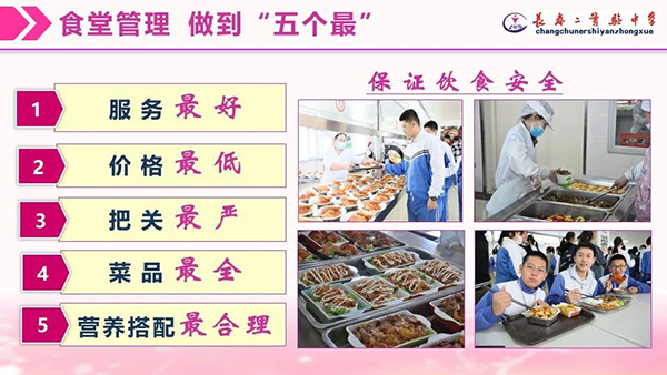 长春市第二实验中学是吉林省首批示范性中学,在李国荣校长提出“以人为本、自主发展”的办学理念引领下,学校对校园食品安全和学生健康成长高度重视,通过深入调研、加强管理、注重反馈多措并举,食堂凭借管理标准化、菜品多元化、服务人性化,先后被吉林省教育厅评为示范食堂,被长春市卫生局评为A级食堂和卫生安全标兵单位,成为了家长和学生们交口称赞的校园“明星食堂”。