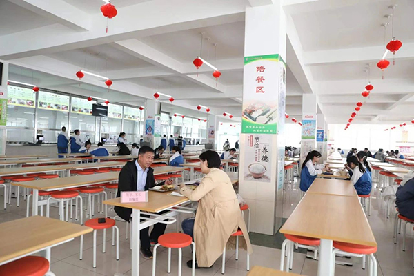 为积极响应“光盘行动”,培养学生文明就餐习惯,学校对学生加强教育、对过程加强监督。学生取餐有序排队、安静文明就餐;严格落实校长和中层以上领导、家长“两陪餐”制度,做到“五看”:一看餐具消毒,二看饭菜质量,三看员工服务质量,四看学生就餐秩序,五看餐具回收情况,保障了良好的就餐环境。