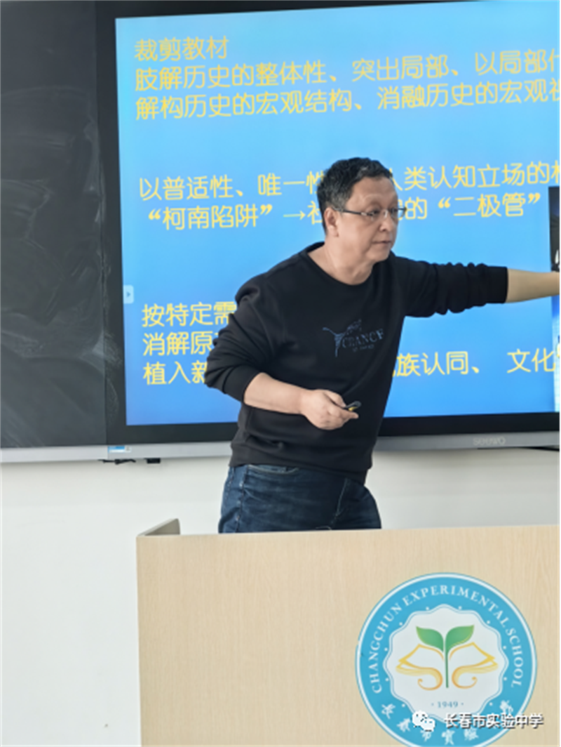长春市实验中学黄大成老师论坛题目是《国家意志与历史教学》。以一则澎湃新闻采访复旦大学教授的报道切入,提示老师们警惕社会中意图消解国家认同与文化认同的恶意行为,作为历史教师应当保持高度的政治敏感性,对于肢解历史整体性,解构历史宏观结构、消融宏观视角的行径予以坚决地批判。黄老师的分享让老师们对于当下社会中纷繁复杂的信息有了更加清晰的判断,也使我们更加明确作为历史教师必须具备高度政治敏感性的素质要求。