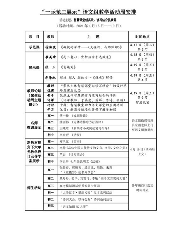 本次活动周以“智慧课堂创高效,读写结合提素养”为主题,积极构建本真课堂,开展了“一示范三展示”的教学活动。