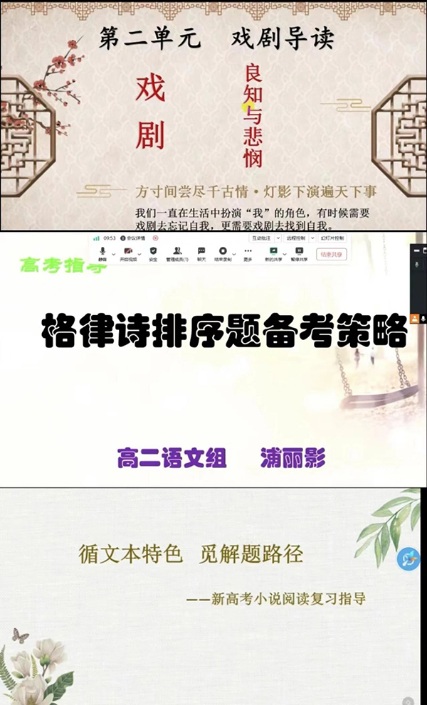 技术赋能教育,教育塑造未来。傅一佳、浦丽影、王曦晗三位教师分别录制了《戏剧导读》、《近体诗排序方法指津》、《新高考小说阅读复习指导》微课,丰富了校本课程资源,体现了学科教学与现代化教学技术的融合。