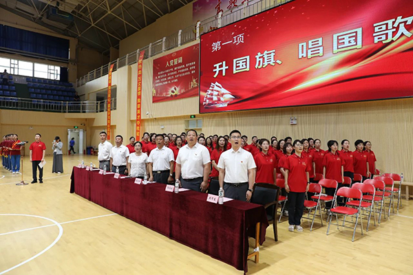 启航仪式在雄壮的国歌声中拉开序幕,全体师生面向国旗神情坚毅,目光坚定,激昂的歌声是市二师生心中澎湃的青春热血。