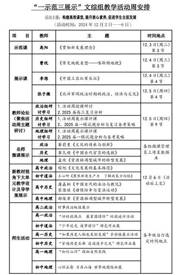 本次活动周文综组以“构建高效课堂,提升核心素养,促进学生全面发展”为活动主题,开展了“一示范三展示” 的教学活动。