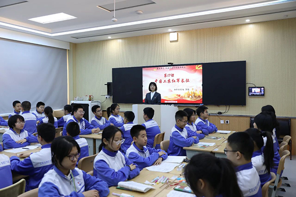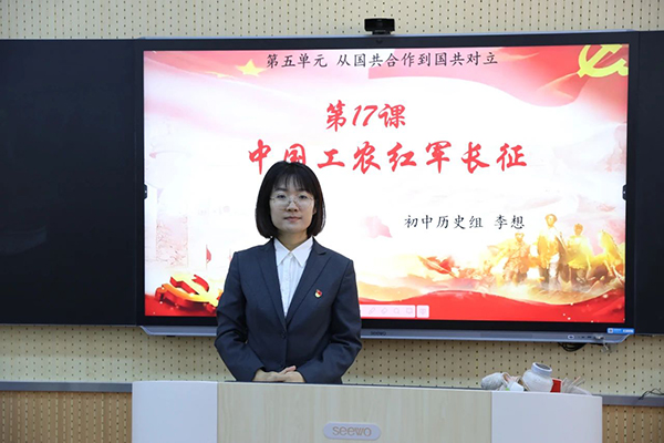初一历史组教师李想承担展示课授课任务,授课内容为《中国工农红军长征》。本节课通过对视频史料、长征路线图等史料的使用和解析,培养学生正确的唯物史观,渗透史料实证的意识。通过学组合作填充长征路线图和介绍沿途重要事件发生的故事、意义,加深对历史的准确理解。通过视频、文字材料感受长征之艰难,带领学生体会长征之精神,树立人生之信念。将历史与现实结合,浸润家国情怀。