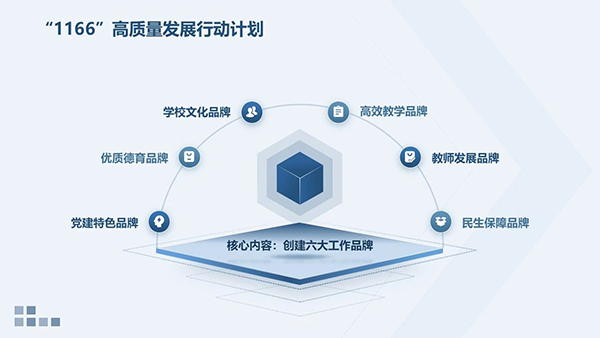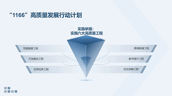 擘画蓝图启新程,乘势奋进谱新篇。“1166”高质量发展行动计划体现了晓天书记和领导班子对于学校高质量发展的使命感和责任心,凝聚着校领导把握当今教育大势的育人智慧和育人情怀,明确了未来的发展方向,为学校的发展奠定了坚实的基础。