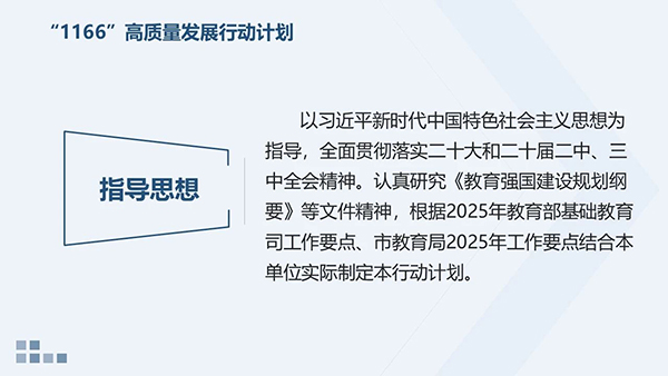 李晓天书记指出,为落实全国教育大会精神和《教育强国建设规划纲要(2024—2035)》,制定了学校的“1166”高质量发展行动计划(即:遵循一个指导思想、实现一个发展目标、打造六项品牌、实施六大工程),不断推动学校高质量发展,努力将学校建设成为全国一流水平的示范性、实验性、国际性特色学校。