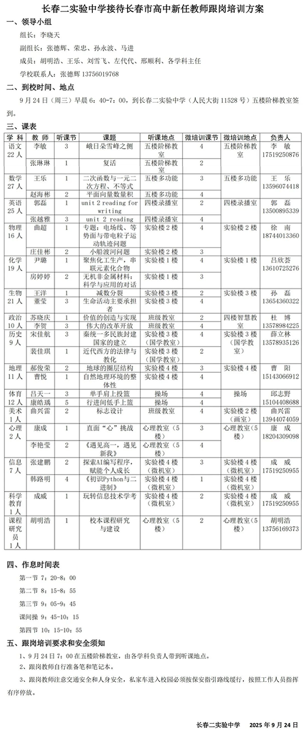 长春市第二实验中学高度重视本次培训,由李晓天书记统筹规划;教务处、教研室、总务处及各学科主任协同发力,从签到流程到课程安排、从安全管理到后勤保障,事无巨细皆为新教师铺就成长之路。每学科配备2名优秀骨干教师担任“双导师”,以“示范课+微培训”模式精准赋能——示范课聚焦“1+1+x+AI”,微培训深挖教学设计精髓,实现理论与实践的深度融合。