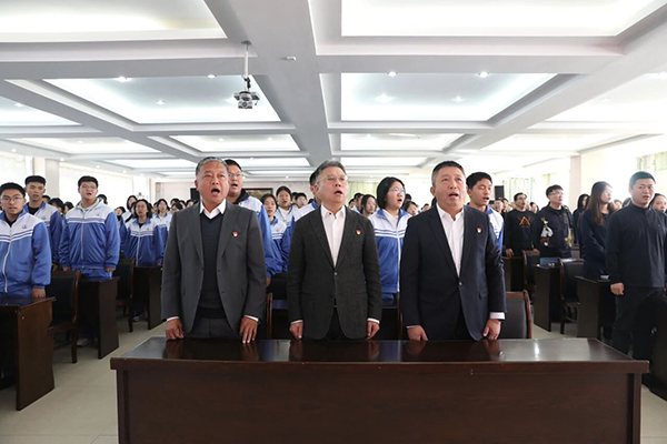 庄严的国歌声响彻多功能厅和各个班级,全体师生整齐肃立,目送鲜艳的五星红旗冉冉升起。
