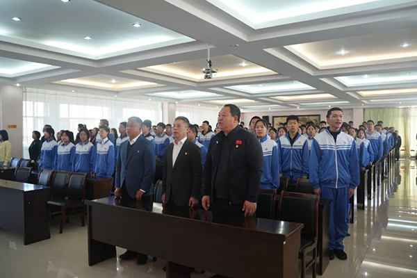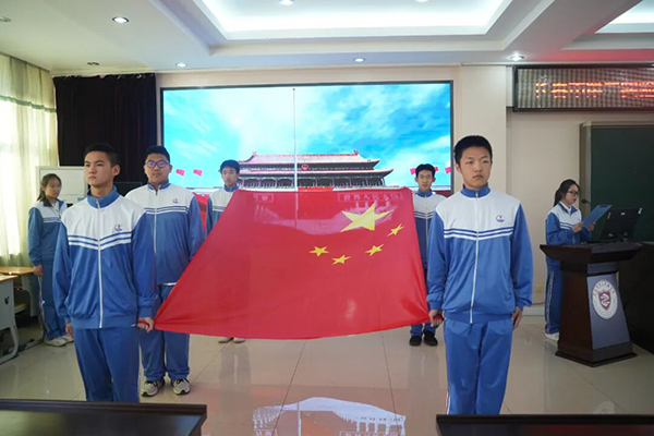 庄严的国歌声响彻多功能厅和各个班级,全体师生整齐肃立,目送鲜艳的五星红旗冉冉升起。