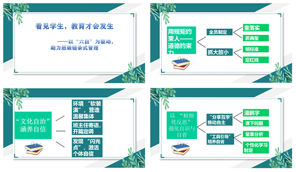 她以《“看见”学生,教育才会发生》为题,分享了如何通过激发学生内在动力,构建自主管理机制的教育实践。她指出,真正的教育始于“看见”,看见每一位学生的独特与需求。她从班级管理的精细化到学习方式的个性化,每一个环节都渗透着对学生主体地位的尊重和对学生全面发展的深切关怀。通过系统性的培养,学生的自主、自律、自强、自信、自省、自识能力得到了全面提升,展现出积极向上、勇于担当、善于学习、乐于反思的良好精神风貌。在她的班级里,班级不再是管理的孤岛,而是成为了学生自我教育、自我成长的沃土。芦老师的分享充满了教育的温度与洞察力,让在场老师深受启发。