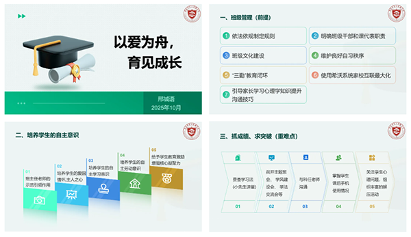 邢老师进行了题为《以爱为舟,育见成长》的精彩汇报。他从自身学科背景出发,阐述了如何以爱心为基石,引导学生从“被动接受”转为“主动探究”,让学习从“任务”转为“内在需求”。他坚信,当学生的内驱力被唤醒,高考佳绩便是水到渠成的自然结果。邢老师的分享生动诠释了 “五育融合培根铸魂,‘六自’教育助力成长” 的先进理念。