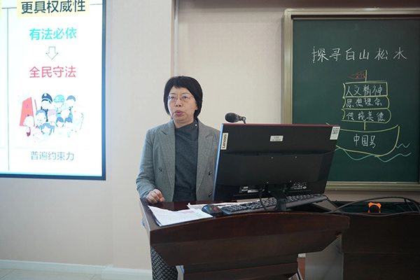 活动第五项由长春理工大学马克思主义学院郑寰宇教授以《“新十六字方针”的历史逻辑》为题目进行了精彩的讲座,他以丰富的方法和生动的案例展现出深厚的教学功底,传递出对教学的热情和专注,深深感染了现场教师。郑教授在讲座中分享了结合新时代发展中国法治进程,指出法律体系建成后需要科学立法,执法要严格且有温度,司法需提升效率与公正性。同时强调全民需增强责任意识,还提及劳动教养制度废除等相关法治事件。教师们纷纷表示这是一次宝贵的学习交流机会,受益匪浅,今后要按照习近平总书记的嘱托和要求,厚植知识、涵养德行,努力做精于传道授业解惑的“经师”和“人师”的统一者。