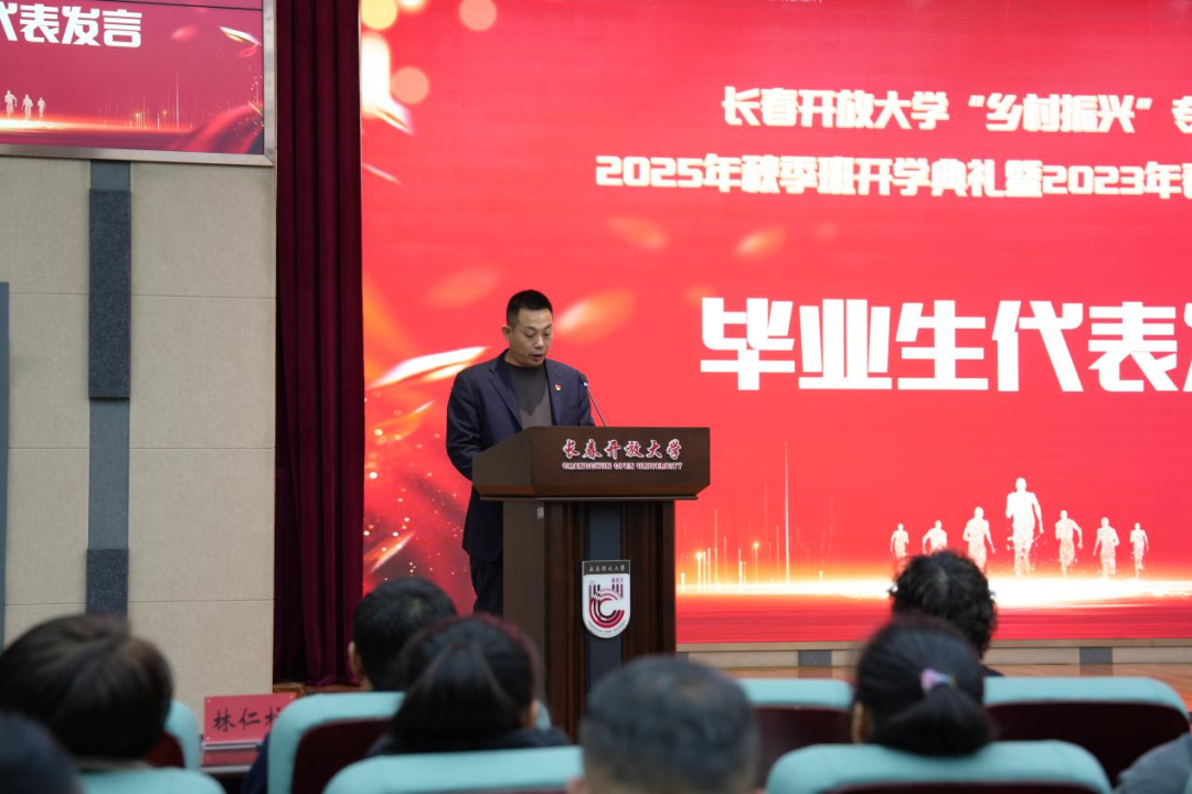 长春开放大学直属学院院长王春妍副教授作为教师代表,深情回顾了陪伴学员成长的温暖历程。她鼓励新老学员以“空杯心态”补短板,不断汲取新知识;以“攻坚姿态”破难题,勇敢面对挑战;以“赤子之心”担使命,在乡村振兴的伟大实践中书写精彩人生。