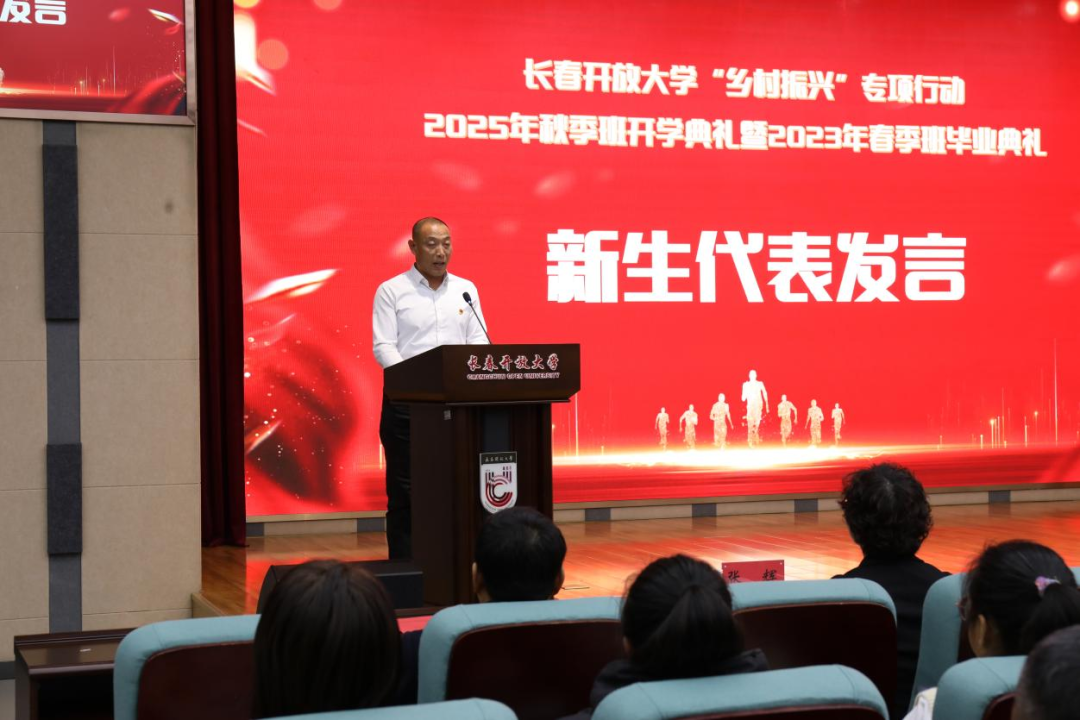 2025年秋季农村区域发展专业本科新生、双阳区太平镇桦木村村书记王成作为新生代表发言。他目光坚定,充满期待地表达了对未来学习的憧憬。他非常珍惜这来之不易的学习机会,并要把课堂所学转化为服务家乡的实际行动,为桦木村的振兴发展贡献自己的力量。