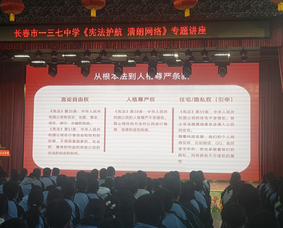 此次讲座是学校法治教育的生动一课,未来长春市一三七中学将持续开展普法活动,创新法治宣传形式,让宪法精神真正融入青春成长,引导学生在法治轨道上明辨是非、规范言行,为构建清朗网络环境、守护青少年健康成长筑牢坚实的法治根基。