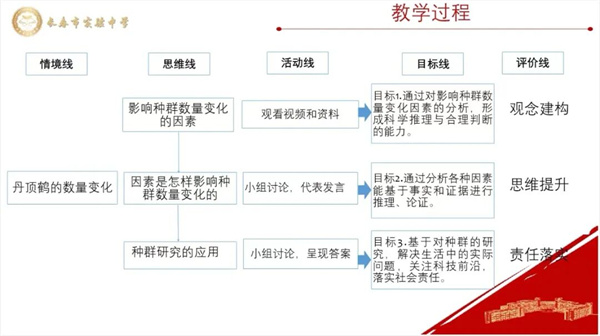 生物学科黄立龙老师以“影响种群数量变化的因素”为主题,以“丹顶鹤的数量变化”为真实情境线切入,围绕“因素识别—作用机制—实践应用”展开思维线。通过小组讨论、代表发言、方案展示等活动,引导学生层层深入,在解决问题中建构生命观念、提升科学思维,并自然落实生态保护的社会责任,实现了“观念—思维—责任”的目标闭环。