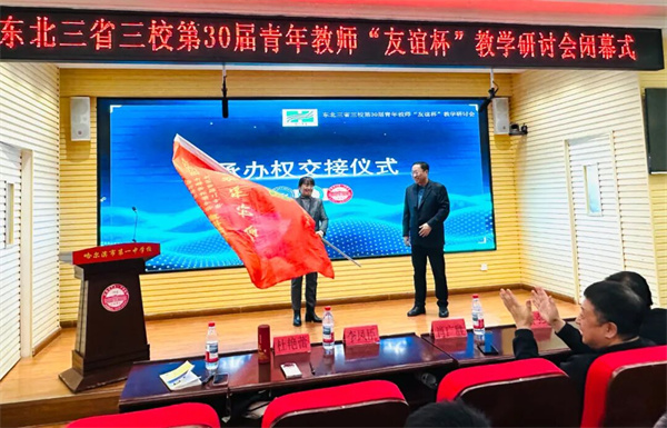 随后,大会颁发授课及评课证书,并举行了庄重的会旗交接仪式。哈尔滨市第一中学校将“友谊杯”会旗交至长春市实验中学手中,标志着2026年第31届教学研讨会将于长春举办。三校相约:明年,长春再聚!