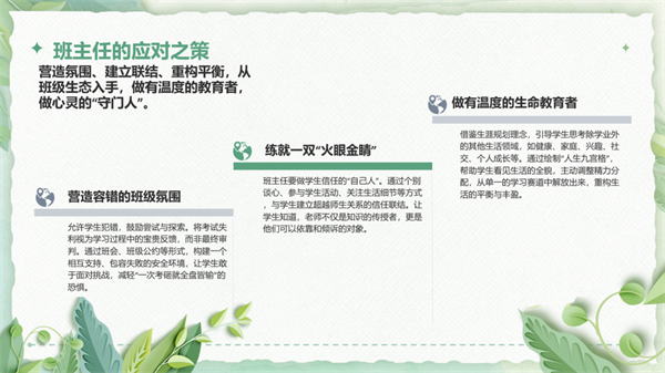 贾迎梅老师在班主任培训会上以“匠心育人,骐骥驰骋”为主题,分享班级管理经验。她强调通过精细常规管理为学生成长铺路,推行“每日一题、每日一讲”促进深度学习;凝聚班级合力,营造温暖互助文化;推行学生自治,唤醒内驱力。同时注重假期成长、心理疏导与家校协同,构建班主任、科任教师、家长三方统一战线。她认为,教育是守护心灵、托举梦想的过程,愿以匠心守护每一匹“骐骥”,助力他们在青春赛道上自信驰骋、圆梦未来。