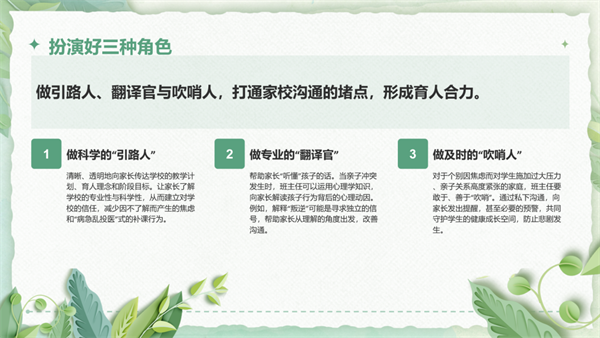 李楠老师在班主任培训会上以“守护心灵,家校同频”为主题,分享了她在西安学习后的思考。她指出,当前学生面临“内卷”与“空心”的双重压力,班主任应成为学生心灵的“守护人”,通过营造安全氛围、敏锐观察情绪、开展生命教育等方式,帮助学生建立心理韧性。同时,她强调家校协同的关键在于引导家长走出焦虑,尊重教育规律,不以分数为唯一标准。她呼吁班主任做有温度的“翻译官”和“吹哨人”,让家长看见孩子的成长,也让教育回归“慢”的智慧。最终,她希望班主任们能用专业与爱心,成为照亮孩子前行的光。